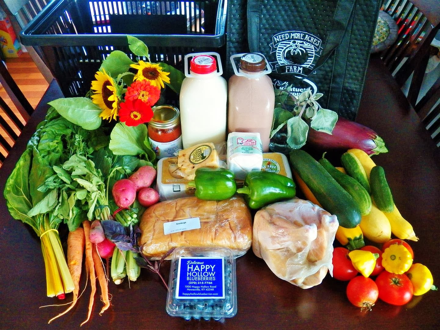 Our farmers are cool. This isn’t your normal CSA, and these aren’t just produce baskets. Each week we are getting protein, bread, and dairy products from various local suppliers in addition to the NMA produce. Some weeks have bonus items like soup, salad dressing, soap, or herbs and there’s always a different bulk food item like pasta, beans, rice, sugar, etc. We even got something called quinoa one time. It’s usually more food than we eat in a week, and it’s fun to share or trade extra stuff (eggplant) with friends and neighbors. [No offense, eggplant. People tell me you are delicious.]