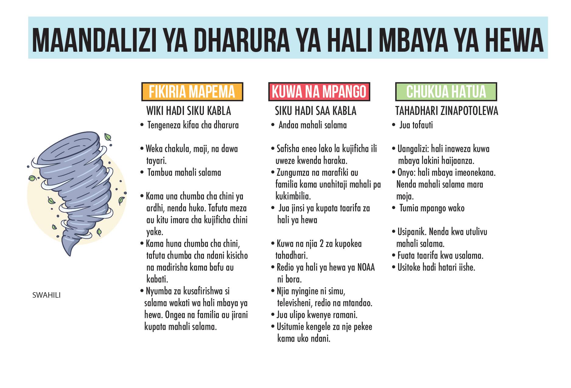 SWAHILI/Tanzania, Kenya, Uganda, Burundi, Rwanda, and the Democratic Republic of Congo communities.